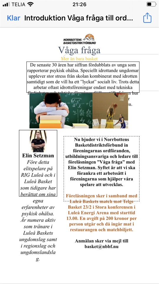 Luleå Basketcentrum och Luleå Basket bjuder in till en clinic för ungdomscoacher med Robin Sandberg från Luleå Basket. Tisdag 4 februari kl 18-19.30 i Luleå Energi Arena A Innehåll: Försvar! En clinic om lagförsvar och hur man kan bryta ner defensiva principer. Både spelet på boll men kanske framför allt utan boll kommer vara fokus. Hur man kan styra anfallet och vara beredd på vad som kan hända samt roteringar defensivt. Anmäl intresse till info@basketcentrum.nu innan 3/2 med namn samt vilket lag/förening du representerar. Vill ditt lag vara träningsgrupp? Anmäl det till ovan epost adress. BK Höken 29 jan 2020 0kommentarer